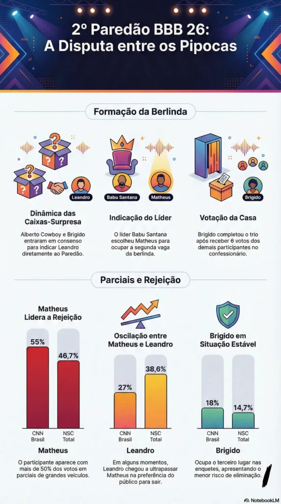 E os outros dois? Leandro vem oscilando entre a segunda posição e um certo alívio. Dependendo da enquete, ele aparece com 26% a 38% dos votos. Já o Brígido tá tranquilaço na rabeira, com apenas 11% a 20% — ou seja, o cara tá mais seguro que cofre de banco (ironia poética, já que o Matheus é bancário).